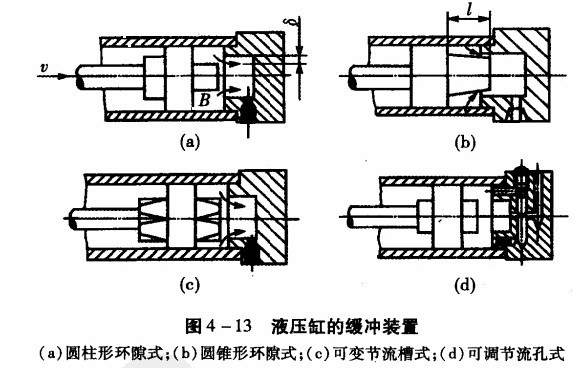 (1)圓柱形環(huán)隙式緩沖裝置:如圖4-13(a)所示。當(dāng)緩沖柱塞進(jìn)入缸蓋內(nèi)孔時(shí),被封閉的油必須通過間隙才能排出,從而增大了回油阻力,使活塞速度降低。這種結(jié)構(gòu)因節(jié)流面積不變,所以隨活塞速度的降低,其緩沖作用也逐漸減弱。