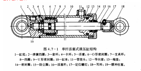 圖4.7-1為一種常見的單懺雙作用活塞式液壓缸。當油體固定時,口A進液,口B回液,返回行程時,迸液腔和回液膠交換。液壓缸通常缸體、銷量在、缸底、活塞、耳環(huán)、導向套及密封組件組成。