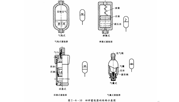 除彈簧式外,它們都是先通過充氣閥向氣囊或氣缸內(nèi)充入一定壓力的氣體,充氣后將充氣閥關(guān)閉,使氣體被封閉在氣囊或氣缸內(nèi)。工作時,油液從蓄能器下部的液壓油人口進(jìn)入蓄能器,壓縮氣體直至達(dá)到平衡,這樣在蓄能器氣囊或氣缸下方的腔體內(nèi)就儲存了一定壓力的液壓油。其他的蓄能器的工作原理類似。