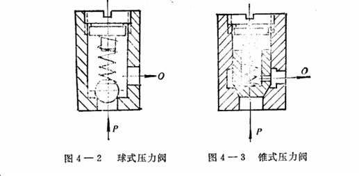 直動式溢流閥的工作原理如圖4-1所示,就溢流閥閥芯結構形式而言,圖4-1是滑閥式直動壓力閥。除此而外常見的還有球閥式和錐閥式,如圖1-2和圖4-3所示,它們統(tǒng)稱為閥座式壓力閥。在油壓小于彈簧力時,球形閥芯和錐形閥芯在彈簧力作用下緊緊壓在閥座上,密封性較好,閥芯和閥套之間沒有如同滑閥式壓力閥具有一定油封長度而產(chǎn)生的動作死區(qū)。只要油壓力超過彈簧力,閥芯立即開啟,靈敏性很高,壓力超調(diào)量小,所以在導控式溢流閥巾,不論導閥和主閥普遍采用錐閥結構。但因直動式球閥和錐閥式壓力閥在大流最時易發(fā)生振動和噪音,閥芯易和閥座發(fā)生撞擊,壽命短,故一般多作為安全閥使用。